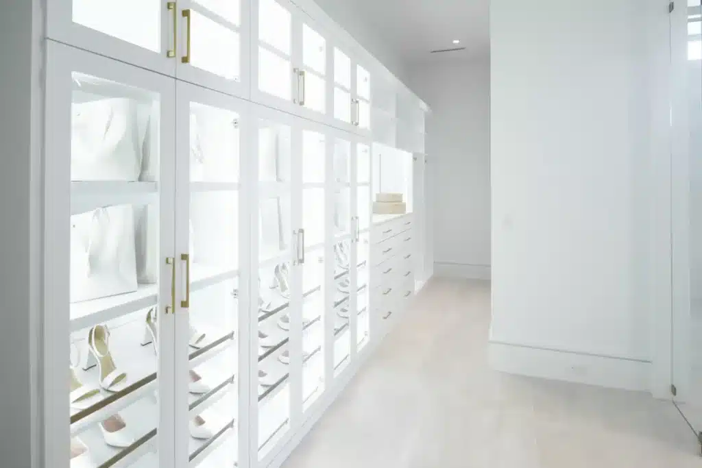 Upgrade your custom shoe closet with illuminated display solutions that blend luxury, convenience, and modern design for the ultimate shoe showcase.
