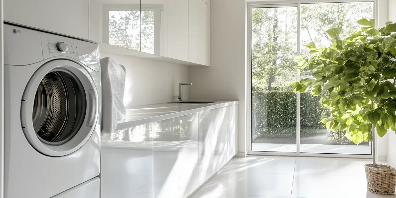 - Glossy Custom Cabinets: The high-gloss cabinets enhance the modern aesthetic while providing ample storage, keeping the laundry room clutter-free.